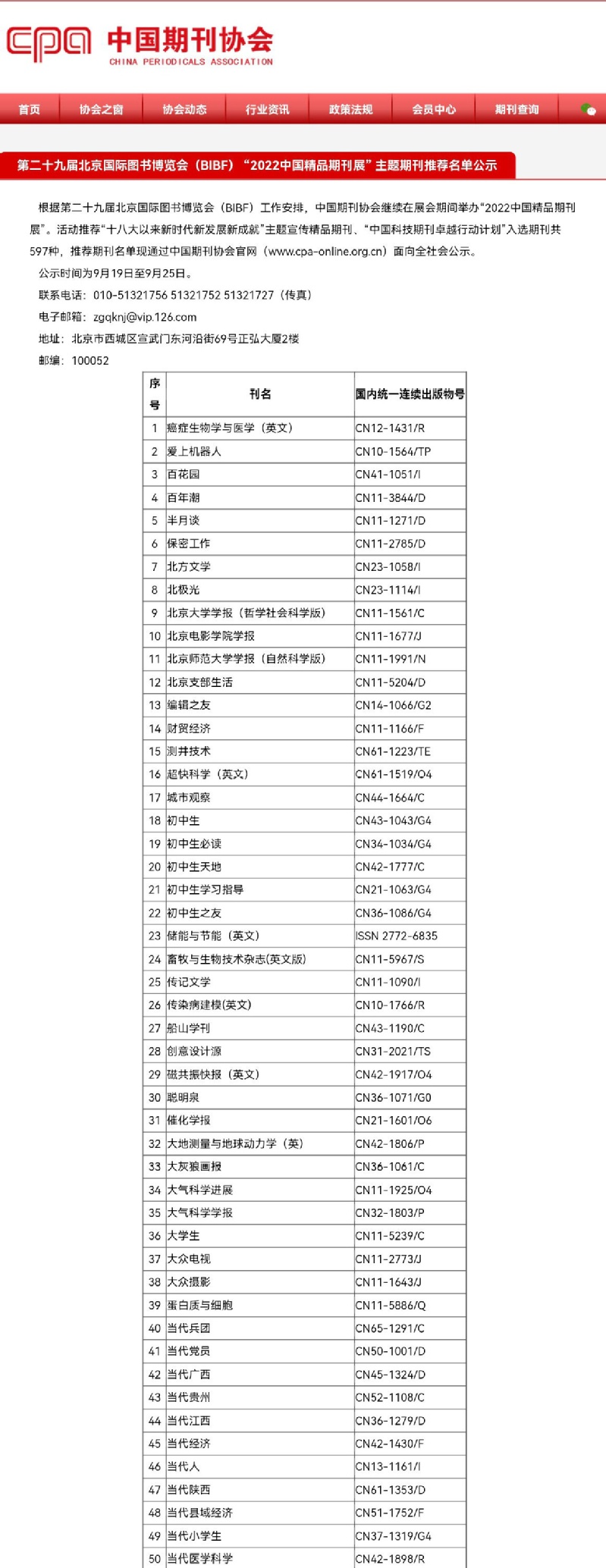 根据第二十九届北京国际图书博览会(BIBF)工作安排,中国期刊协会继续在展会期间举办“2022中国精品期刊展”。活动推荐“十八大以来新时代新发展新成就”主题宣传精品期刊、“中国科技期刊卓越行动计划”入选期刊共597种,推荐期刊名单现通过中国期刊协会官网(