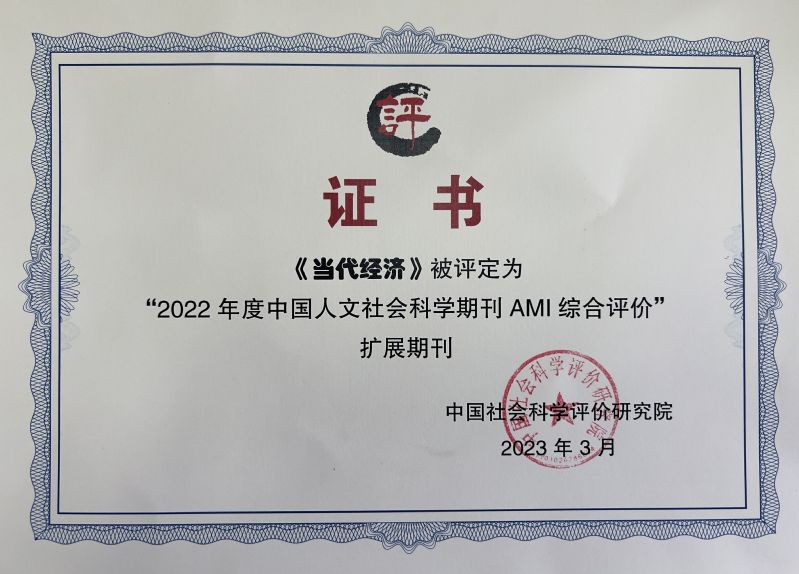 由中国社会科学评价研究院组织开展中国社会科学期刊评价工作每四年开展一次,本次评价采用定性定量相结合,客观公正,公开透明,极具权威性。2022年,在对中国人文社会科学33个学科类的1924种老牌刊、117种新创刊和148种外文刊,共计2189种期刊评价的基础上,经过三轮严格评审,《当代经济》被评为“2022年度中国人文社会科学期刊AMI综合评价”扩展期刊。