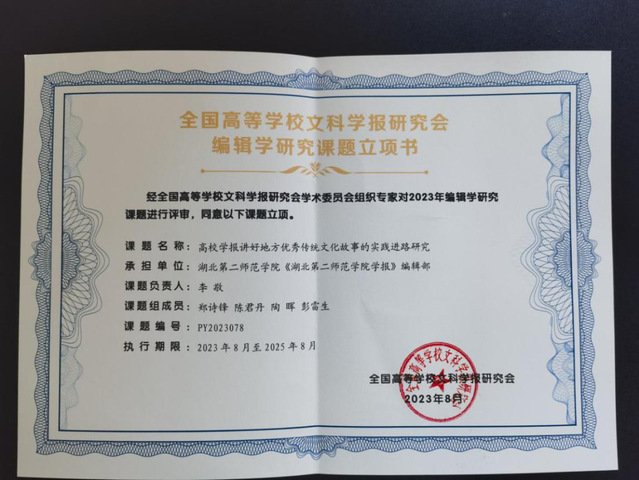 8月,全国高等学校文科学报研究会公布了2023年度全国高等学校文科学报研究会编辑学研究课题立项名单。期刊社《学报》李敬老师的《高校学报讲好地方优秀传统文化故事的实践进路研究》获批项目立项。