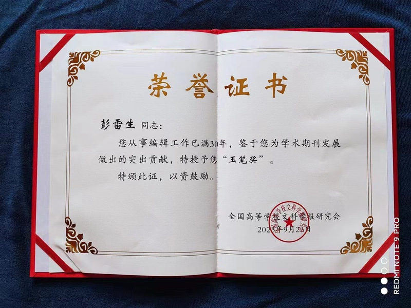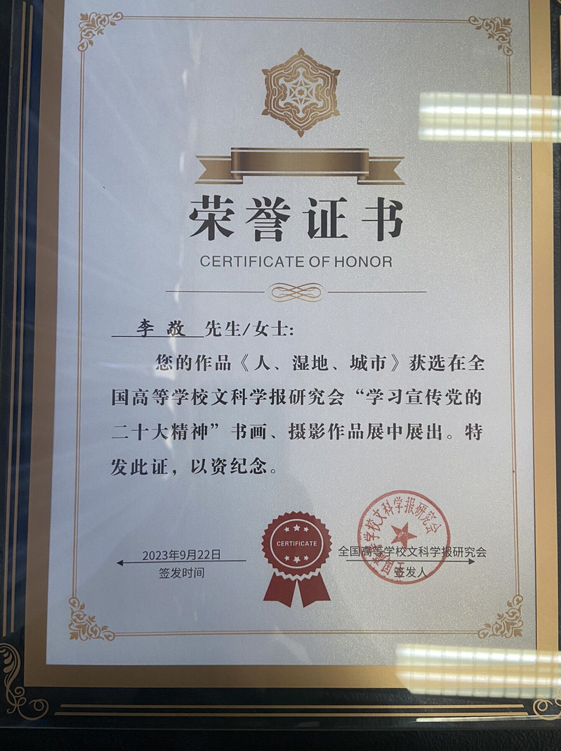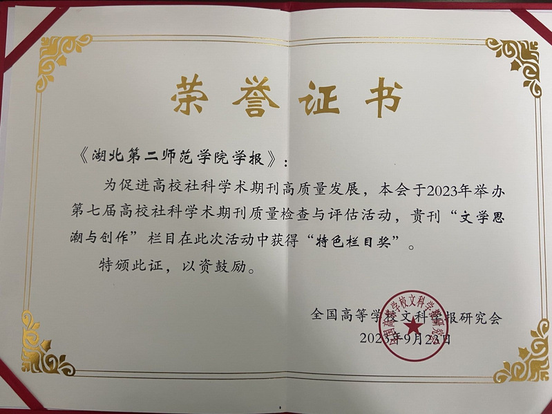 9月23-24日,全国高等学校文科学报研究会第九届理事会第三次会议在湖北宜昌举行,会议宣布全国高等学校文科学报研究会第七届评优结果,《湖北第二师范学院学报》“文学思潮与创作”栏目获评“特色栏目奖”,学报编辑部彭雷生老师荣获“玉笔奖”,李敬老师的摄影作品《人、湿地、城市》获选在全国高等学校文科学报研究会“学习宣传党的二十大精神”书画、摄影作品展中展出。