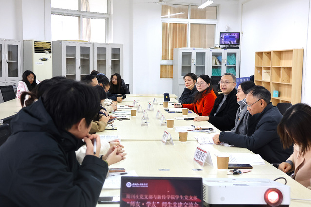 12月5日下午,期刊社党支部、新闻与传播学院学生党支部(以下简称“新传学院”)联合举办“师友·学友”师生党建交流会。此次交流会由期刊社党支部成员、学报编辑部主任陈君丹发起组织,期刊社党支部书记马艳主持,期刊社社长郑诗锋及党支部成员陈光春、刘爱君、李敬参加,新传学院党总支书记徐晓、总支副书记邱媛、学工办主管孙蓓、学生党支部成员王一老师及学生代表参会。活动旨在深入学习贯彻党的二十届三中全会精神,分享师生学习经验,进一步加强双方思想交流。