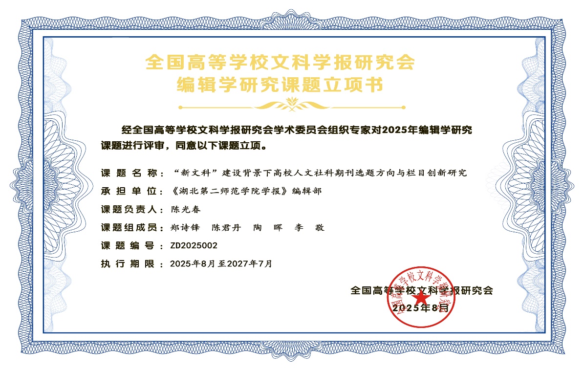 近日,全国高等学校文科学报研究会2025年度编辑学研究项目立项名单正式公布。由我社陈光春教授担任主持人的申报项目《“新文科”建设背景下高校人文社科期刊选题方向与栏目创新研究》(项目编号:ZD2025002)成功获批为重点课题。
